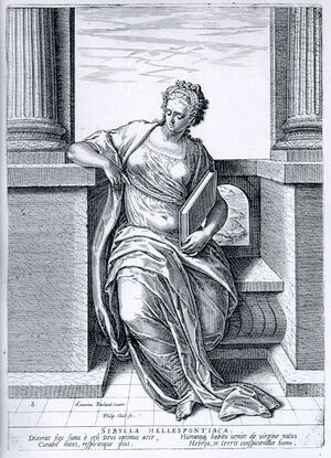 سيبيل الهلسپونطية was the priestess presiding over the Apollonian oracle at Dardania. The Sibyl is sometimes referred to as the Trojan Sibyl. The word Sibyl comes (via Latin) from the Ancient Greek word sibylla, meaning prophetess or oracle. The Hellespontine Sibyl was known, particularly in the late Roman Imperial period and the early Middle Ages, for a claim that she predicted the crucifixion of Jesus Christ.[1] This claim comes from the Sibylline Oracles, which are not to be confused with the Sibylline Books.