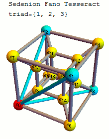 The 35 triads that make up this specific sedenion multiplication table with the 7 triads of the octonions used in creating the sedenion through the Cayley–Dickson construction shown in bold: