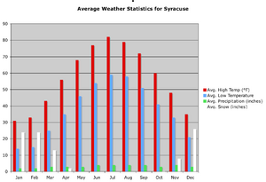 Syracuse on average receives an annual precipitation of 38.47 بوصات (977 ميليمتر), with the months of July through September being the wettest in terms of total precipitation,[29] while precipitation occurs on more days each month during the snow season.[31]