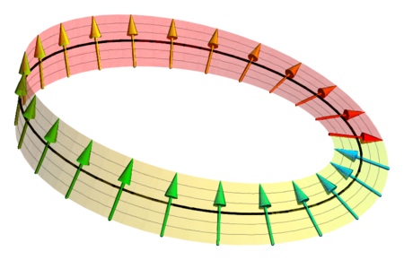 A spinor visualized as a vector pointing along the Möbius band, exhibiting a sign inversion when the circle (the "physical system") is continuously rotated through a full turn of 360°.[أ]