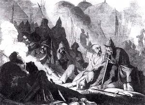 Sviatoslav began by rallying the East Slavic vassal tribes of the Khazars to his cause. Those who would not join him, such as the Vyatichs, were attacked and forced to pay tribute to the Kievan Rus' rather than to the Khazars.[23] According to a legend recorded in the Primary Chronicle, Sviatoslav sent a message to the Vyatich rulers, consisting of a single phrase: "I want to come at you!" (Old East Slavic khochiu na vy iti)[24] This phrase is used in modern Russian and Ukrainian (usually misquoted as idu na vy) to denote an unequivocal declaration of one's intentions. Proceeding by the Oka and Volga rivers, he attacked Volga Bulgaria. He employed Oghuz and Pecheneg mercenaries in this campaign, perhaps to counter the superior cavalry of the Khazars and Bulgars.[25]