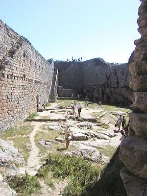 The small ruins of the terraced dwellings, immediately outside the perimeter of the current fortress walls on the north-eastern flank are, however, confirmed to be traces of authentic former Cathar habitations.