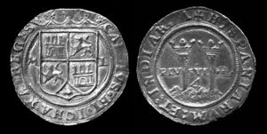 Obverse: CAROLVS ET IOHANA, REGES (Charles and Johanna, Monarchs). Depicts the crest of Castile and León. The strike date was determined by the Assayer L. Reverse: HISPANIARVM ET INDIARVM (للاسبانْيَات [الممالك الإسبانية] وبلاد الهند." Depicts the Strait of Gibraltar between the Pillars of Hercules. Center Latin motto is PLVS VLTRA, or "Further Beyond."