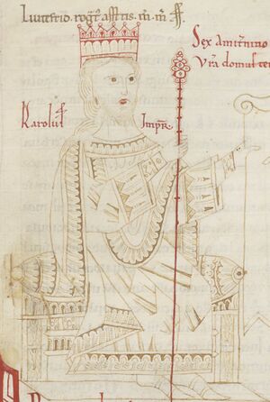 His numeral is roughly contemporary. Regino of Prüm, a contemporary of Charles's recording his death, calls him "Emperor Charles, third of that name and dignity" (Latin Carolus imperator, tertius huius nominis et dignitatis).[2]