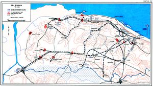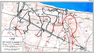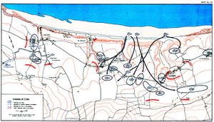 ![]() D-Day assault map of the Normandy region and the north-western coast of France. Utah Beach and Omaha Beach are separated by the Douve River, whose mouth is clear in the coastline notch (or "corner") of the map. |