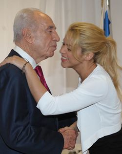 شاكيرا تقبل الرئيس الإسرائيلي شمعون پـِرِس أثناء زيارتها للقدس، يونيو 2011.