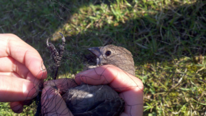 أنثى شُحرُور بقر بُنيَّة الرأس عالقة في إحدى الشباك المنصوبة للقبض على الطيور.