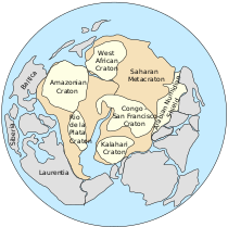 The Bangui anomaly is bounded to the south by the Walvis Ridge, the north by the Cameroon–St. Helena volcanic line, and to the west by the Mid-Atlantic Ridge.[1] It is shaped approximately as an ellipse 700 km × 1،000 km (430 mi × 620 mi) in size. It has three sections, and the magnetic equator runs through its center. It has a short axis diameter of about 550 كيلومتر (340 mi), and its amplitude varies between –1000 nT at ground level and –20 nT at satellite altitude, about 400 كيلومتر (250 mi).[1] Its features include a Bouguer gravity anomaly of −120 mGal, a topographical surface feature shaped as a ring of 810 km (500 mi) diameter, rock features of Late Archean and Proterozoic periods in the central part of the anomaly, granulites, and charnockites rock formations supplemented by granites at the lower crust level, and greenstone belts, and metamorphosed basalts seen as rock exposures.[2] A zone of thinner crust bounds the anomaly to the north and a zone of relatively thicker crust is on the southern edge.[1]