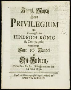 Scottish merchant Colin Campbell, formerly active in the Ostend Company, met with Swedish Niclas Sahlgren during Sahlgren's stay in Amsterdam in the late 1720s. Together they made plans for a Swedish trading company, but it was evident that Campbell was the driving force in the enterprise. Since foreign investors were met with suspicion in Sweden, they needed a respectable Swede to front the company.[22] That person would be commissioner Henrik König, a Swede of German (Bremen) origin.[23]