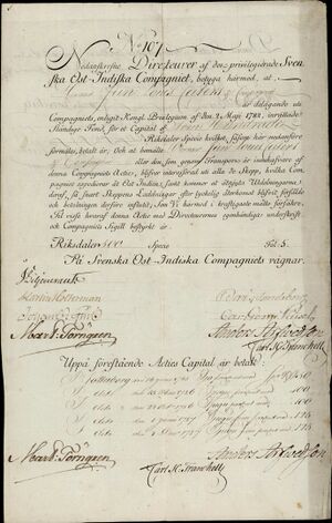 Share of the Svenska Ost-Indiska Compagniet, issued 2. May 1782