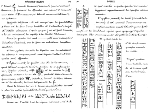 [Translation]: "The notices and the XVIII° letter of Champollion provide a complete and faithful summary of the campaigns of Ramses III (his Ramses Ammon), especially that represented on the north wall, containing the famous bas-relief of a naval battle where the enemy ships are driven to shore by the Egyptian fleet, and simultaneously crushed by the army, which the press on the other side.