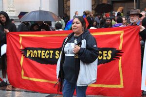 Native people, and particularly native women, are disproportionately incarcerated in California.[66][67] Some native people identify the modern prison-industrial complex as another reproduction of the "punishing institutions" that have been imposed onto them and built on their homelands since the arrival of European settlers, including military forts, ranchos, Spanish missions, Indian reservations, boarding schools, and prisons, each of which exploited native people as a source of labor for the economic interests of settlers. Prison labor in California has also been compared to California's history of forced labor of indigenous people.[68][69]