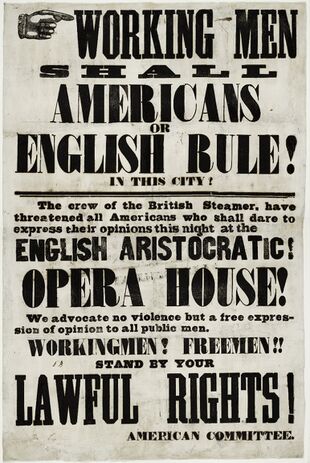 - الشعور المتزايد بالابتعاد الثقافي عن بريطانيا بين الأمريكيين من الطبقة العاملة بشكل أساسي، إلى جانب المهاجرين الأيرلنديين. على الرغم من أن الأمريكيين الأصليين كانوا معاديين للمهاجرين الأيرلنديين، فقد وجد كلاهما سببًا مشتركًا ضد البريطانيين.