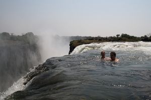 A famous feature is the naturally formed "Armchair" (now sometimes called "Devil's Pool"), near the edge of the falls on the Zambian side, along the western tip of Livingstone Island. When the river flow is at a certain level, usually between September and December, a rock barrier forms an eddy with minimal current, allowing adventurous swimmers to splash around in relative safety in front of the point where the water cascades over the falls.[33] One death of a tourist guide has been reported.[34]