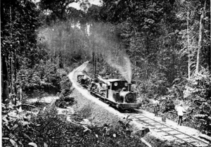 Since the 18th century, tobacco was North Borneo's foremost planting industry.[70] The logging history in North Borneo can be traced since the 1870s.[71] From 1890s, hardwood exports increased,[72] with logging expanding during the interwar period.[40] In the 1900s, North Borneo joined the rubber boom. The completion of North Borneo Railway Line helped to transport the resources to a major port on the west coast. By 1915, around 34،828 acre (14،094 ha) of land, in addition to Chinese and North Borneo smallholdings, had been planted with rubber tree.[69] In the same year, the Governor of North Borneo, Aylmer Cavendish Pearson invited Japanese emigrants to participate in the economic activities there. The Japanese government received the request warmly and sent researchers to discover potential economic opportunities.[73]