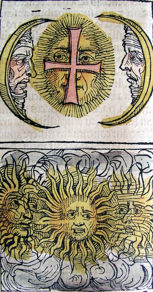 من المفترض أن تتضمن مقدمة معركة صليب مورتيمر في هرفوردشاير، إنگلترة عام 1461 ظهور هالة مع ثلاث "شموس". أقنع قائد اليوركيين، لاحقاً إدوارد الرابع ملك إنگلترة، قواته الخائفة في البداية بأنها تمثل أبناء دوق يورك الثلاثة، وأن قوات إدوارد حققت نصراً حاسماً. قام ويليام شكسبير بتمثيل الحدث الدرامي في الملك هنري السادس، الجزء 3،[15] وبقلم شارون كاي پنمان في ذا سن إن سپلندر.