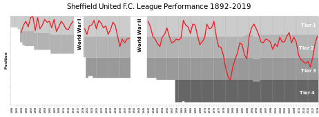 Undoubtedly United's heyday was the 30-year period from 1895–1925, when they were champions of England in 1897–98 and runners-up in 1896–97 and 1899–1900, and FA Cup winners in 1899, 1902, 1915 and 1925. United have not won a trophy since 1925, bar those associated with promotion from lower leagues, their best performances in the cup competitions being several semi-final appearances in the FA Cup and League Cup.[4]