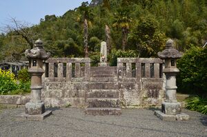 On January 21, 1611, he died of illness in Kokubu Castle.[8][1] Posthumously, he was named 貫明存忠庵主. He was buried at what had once been the site of Fukushoji in Kagoshima - his tombstone remains, along with those of the other leaders of his clan. There are also monuments built in his memory at Kokubun, Ima Kumano Kannonji (今熊野観音寺) in Kyoto, and Koyasan. Though there is no portrait of Yoshihisa remaining, there is a bronze figure of Yoshihisa at the Taiheiji, depicting his surrender to Hideyoshi. The statue was produced after he died.