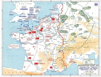 Operation Overlord with combined bomber offensive June 1944: Schweinfurt (checkered hatching in the German centre) was the only primary target of the Allies in Bavaria.