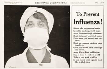 مثال لنصائح تاريخية للصحة العامة من 1918 في نيو هيڤن، كنتيكت، بالولايات المتحدة (مماثلة للرسائل الحالية فيما يتعلق بـ جائحة كوڤيد-19)