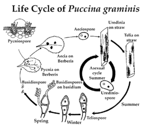 فطر صدأ القمح من الأصداء ثنائية العائل إذ يمضي دورة حياته على عائلين مختلفين حيث يكون الطورين البكني والأسيدي على نباتات الباربري Berberis vulgaris أما الطورين اليوريدي والتيليتي فيتكونان على القمح. الجراثيم اليوريدية كروية أو بيضاوية الشكل بنية اللون وتتكون من خلية واحدة ذات جدار مزدوج شفاف اللون تظهر عليه أشواك دقيقة. والجراثيم التيليتية لها عنق طويل شفاف تتكون من خليتين جدارهما سميك وأكثر سمكا عند قمة الجرثومة. تنبت الجرثومة التيليتية بعد فترة السكون ويتكون عليها حامل بازيدي يحمل اربعة جراثيم بازيدية تنتقل بواسطة الهواء لتصيب نبات الباربري الذى يتكون عليه الطور البكني والأسيدي ثم تنتقل الجراثيم الاسيدية بالهواء لتصيب القمح ويتكون عليه البثرات اليوريدية والتيليتية وبذلك تتم دورة حياة مرض الصدأ.