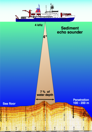 تستخدم ظاهرة الصدى لقياس عمق الماء تحت السفينة بأسلوب ممـاثل. ويلجأ هنا لاستخدام أمواج فوق صوتية ultrasonic تولِّدها دارات مهتزة لهذه الغاية، فتنعكس بعد ارتدادها على قاع البحر إلى ميكروفون مائي hydrophone تحمله السفينة على هيكلها. وبالطبع لا تتحسس أذن الإنسان بهذه الأمواج حيث أن ترددها يتجاوز الـ20كيلو هرتز، وتمتاز الأمواج فوق الصوتية بمقدرتها على الانتشار لمسافات بعيدة دون أن ينالها الضعف أو الوهن. ثم إن الصوت ينتشر في الماء بسرعة أعلى من سرعة انتشاره في الهواء، إذ تبلغ هذه السرعة 1450متراً في الثانية أي ما يعادل أربع مرات تقريباً سرعته في الهواء. ويعمل جهاز تحمله السفينة على تحويل المعلومات وتسجيلها بحيث يرتسم على أسطوانة دوارة تغير عمق الماء تحت السفينة على طول المسار الذي تسلكه.