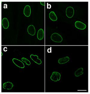 Defects in the genes encoding for nuclear lamin (such as lamin A and lamin B1) have been implicated in a variety of diseases (laminopathies) such as:[7]