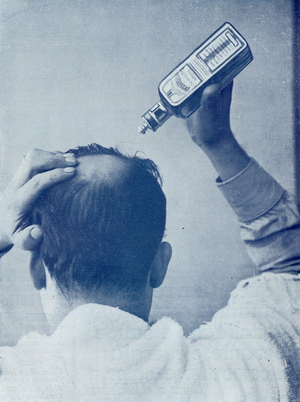 - المينوكسيديل (روجين) دواء يُصرف بدون وصفة طبية، ومُعتمد لعلاج الصلع الوراثي لدى الرجال والثعلبة البقعية. يُدلك على فروة الرأس مرتين يومياً على شكل سائل أو رغوة. قد يُصاب بعض الأشخاص بحساسية تجاه الپروپيلين گليكول الموجود في محلول المينوكسيديل، وقد طُوّرت رغوة المينوكسيديل بدون الپروپيلين گليكول. لن يُعيد هذا الدواء نمو الشعر لدى جميع المستخدمين. يُوصف المينوكسيديل أيضاً على شكل أقراص تُؤخذ عن طريق الفم لتحفيز نمو الشعر، على الرغم من أنه غير معتمد من قبل إدارة الغذاء والدواء الأمريكية لعلاج فقدان الشعر.[34] كلما طالت مدة توقف نمو الشعر، قل احتمال عودة نموه بعد استخدام المينوكسيديل. المينوكسيديل غير فعال في علاج أسباب فقدان الشعر الأخرى. قد يستغرق نمو الشعر من شهر إلى ستة أشهر. يجب الاستمرار في العلاج لأجل غير مسمى. في حال توقف العلاج، يعود فقدان الشعر. سيتساقط أي شعر عاد للنمو أو أي شعر معرض للتساقط أثناء استخدام المينوكسيديل. الآثار الجانبية الأكثر شيوعاً هي تهيج خفيف في فروة الرأس، والتهاب الجلد التماسي التحسسي، وظهور شعر غير مرغوب فيه في أجزاء أخرى من الجسم.[32]