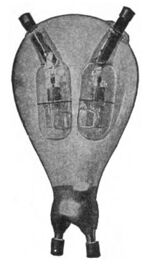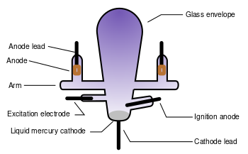 The earliest type of mercury vapor electric rectifier consists of an evacuated glass bulb with a pool of liquid mercury sitting in the bottom as the cathode.[7] Over it curves the glass bulb, which condenses the mercury that is evaporated as the device operates. The glass envelope has one or more arms with graphite rods as anodes. Their number depends on the application, with one anode usually provided per phase. The shape of the anode arms ensures that any mercury that condenses on the glass walls drains back into the main pool quickly to avoid providing a conductive path between the cathode and respective anode.
