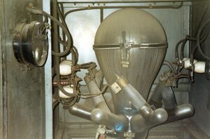 Mercury arc valves were used extensively in DC power systems on London Underground,[14] and two were still observed to be in operation in 2000 at the disused deep-level air-raid shelter at Belsize Park.[15] After they were no longer needed as shelters, Belsize Park and several other deep shelters were used as secure storage, particularly for music and television archives. This led to the mercury-arc rectifier at the Goodge Street shelter featuring in an early episode of Doctor Who as an alien brain, cast for its "eerie glow".[16]