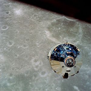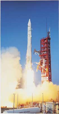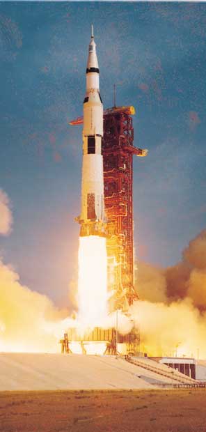 الصاروخ العملاق ساتورن ـ ف الذي حمل أول رائد فضاء إلى القمر يصعد من برج الإطلاق. الصواريخ هي المركبات الوحيدة التي تستعمل لإطلاق البشر والمعدات إلى الفضاء.