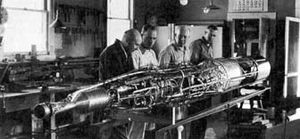 روبرت هتشينجز جودارد عالم الصواريخ الأمريكي الرائد، يفحص صاروخ البنزين والأكسجين ومعه مساعدوه . تم بناء هذا الصاروخ تحت إشراف جودارد عام 1940م.