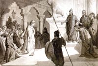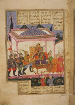 اجتمع ملوك الفرس الى باب الضحاك، و أذعنوا له بالطاعة. فقدم أرضهم، و جلس على تخت السلطنة، و وضع على رأسه تاج الملك، و جمع عساكر البر و البحر ثم ملك الضحاك، و عم ملكه طلاع الأرض شرقا و غربا، و برا و بحرا. الشاهنامه 8:23