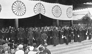 The shrine had a critical role in military and civilian morale during the war era as a symbol of dedication to the Emperor.[16] Enshrinement at Yasukuni signified meaning and nobility to those who died for their country. During the final days of the war, it was common for soldiers sent on kamikaze suicide missions to say that they would "meet again at Yasukuni" following their death.[17][18] Military songs created at that time often included information about Yasukuni, such as Doki no Sakura(同期の桜) and Calming the country(国の鎮め). At that time, however, the coalition saw that Japan, which was in a tight corner, was using Yasukuni for propaganda purposes. The main point is that the Yasukuni is used as a means of pressure to induce soldiers to choose suicide bombing to escape desperate situations, or to socially bury those who are captured or want to surrender.[19]