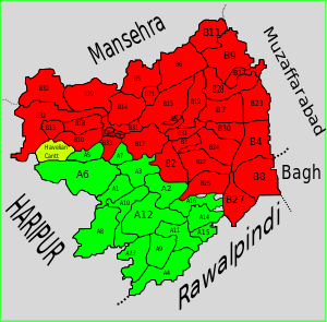 خريطة تبين التقسيمات الادارية لضلع أبت أباد، the Union Councils of Havelian Tehsil are highlighted in green, whilst those of Abbottabad Tehsil are highlighted in red (the names neighbouring districts to Abbottabad are also shown).