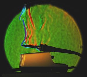 Schlieren-Soldering-Iron-Heat. Note that the soldering iron tip itself is not glowing because it is not Infrared photography. Had the photograph been a composite of Schlieren and infrared, the soldering iron tip would show as a source of illumination and the atmospheric disturbance caused by the heating would show as well. The infrared point of origin or target would be unambiguous.