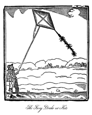 Woodcut print of a kite from John Bate's 1635 book, The Mysteryes of Nature and Art in which the kite is titled How to make fire Drakes.