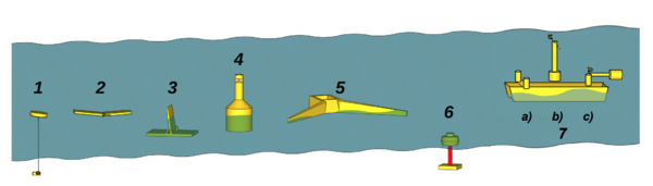 This device floats on the surface, held in place by cables connected to the seabed. The point-absorber has a device width much smaller than the incoming wavelength λ. Energy is absorbed by radiating a wave with destructive interference to the incoming waves. Buoys use the swells' rise and fall to generate electricity directly via linear generators,[16] generators driven by mechanical linear-to-rotary converters,[17] or hydraulic pumps.[18] Energy extracted from waves may affect the shoreline, implying that sites should remain well offshore.[19]