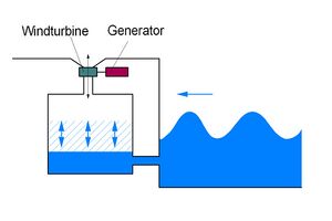Oscillating water column devices can be located onshore or offshore. Swells compress air in an internal chamber, forcing air through a turbine to create electricity.[23] Significant noise is produced as air flows through the turbines, potentially affecting nearby birds and marine organisms. Marine life could possibly become trapped or entangled within the air chamber.[19] It draws energy from the entire water column.[24]