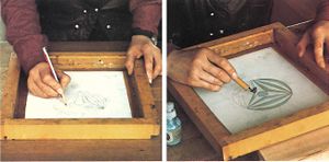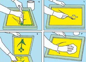 ويستخدم الفنان الرسام الإستنسل (الروسم)، لتغطية الأجزاء التي لا يراد تلوينها من التصميم.