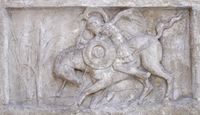 ![]() A horseman, as depicted in a copy of a bas-relief found in the Forum in Rome. It portrays the legend of Mettius Curtius, a Sabine raider who, early the reign of Romulus (ca. 750 BC), is reputed to have evaded capture by the Romans by riding his horse into a marsh that once covered part of the site of the Forum. The swamp was supposedly named the Lacus Curtius ("lake of Curtius") after him.[2] But the image probably portrays the equipment of a Roman knight at the time it was made, ca. 150 BC. The knight wears a composite bronze cuirass, Attic-style helmet with horsehair plume, pteruges, and mantle. He carries a spear and small round shield. Original in Musei Capitolini, Rome |