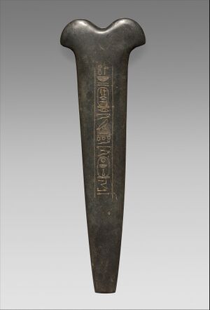 Peseshkef: Believed to mean ‘splitter of his ka-spirit’. These were forked blades made of obsidian, glass, or stone that were created as burial goods. During the Old Kingdom, it is evident that these objects were initially employed to sever umbilical cords during childbirth, a practice that aligns with its spiritual association with rebirth. Nevertheless, the precise ritual in which they were originally intended for during this period remains unclear.[1]
