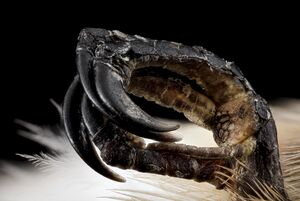 Hummingbird legs are short and have feet with three toes pointing forward and one backward – the hallux.[12][13] The toes are formed as claws (image) with ridged inner surfaces to aid gripping onto flower stems or petals. The middle toe is around 0.6 cm (0.24 in). The ruby-throated hummingbird can only shuffle to move along a branch, although it can scratch-preen with its feet.[10][14]