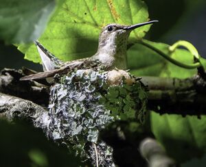 The nest is usually constructed on a small, downward-sloping tree limb 3.1 إلى 12.2 m (10 إلى 40 ft) feet above the ground. Favored trees are usually deciduous, such as oak, hornbeam, birch, poplar or hackberry, although pines have also been used. Nests have even been found on loops of chain, wire, and extension cords.[10] The nest is composed of bud scales, with lichen on the exterior, bound with spider's silk, and lined with fibers such as plant down (often dandelion or thistle down) and animal hair. Most nests are well camouflaged. Old nests may be occupied for several seasons, but are repaired annually.[23] As in all known hummingbird species, the female alone constructs the nest and cares for the eggs and young.