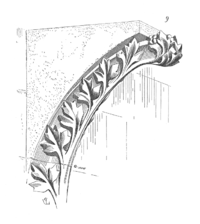 Corbels sometimes end with a point apparently growing into the wall, or forming a knot, and often are supported by angels and other figures. In the later periods the carved foliage and other ornaments used on corbels resemble those used in the capitals of columns.[1]