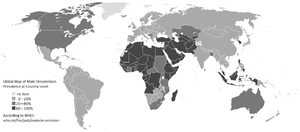 خريطة من الأمم المتحدة (منظمة الصحة العالمية/UNAIDS) توضح نسبة الذكور المختونين، على مستوى الدول. البيانات جمعتها MEASURE DHS [1] ومصادر أخرى. [2]