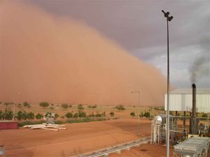 تقلل العواصف الرملية من وضوح الرؤية وتشكل خطرًا على انسياب حركة السيارات في طرق الصحراء، كما أنها تسهم في تدمير المحاصيل. خلال العواصف الرملية تتحرك الرمال في دفعة قوية، وعندما تزداد سرعة الرياح تلتف حبات الرمل متحركة إلى الأمام لتصطدم بحبات أخرى، فتدفعها أيضا إلى الأمام. وبعض هذه الحبات تسقط ثم تتحرك مرة أخرى بعد أن تصطدم بحصاة أو صخرة، وبعضها الآخر يدفن. ولكن الاصطدام يتسبب في دفع حبات أخرى إلى الهواء.