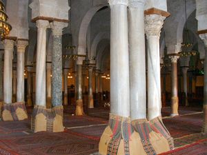 يعتبر جامع القيروان الكبير أباً لجميع المساجد في الغرب الإسلامي. بنى عقبة بن نافع فاتح من شمال أفريقيا مسجدا بسيطاً هناك و أعيد بناءة وتوسيعه عام 695. من الخارج أم من الداخل ، تُعتبر الأحسن محفوظة, نمطية من أوئل النماذج النمطية للمساجد الإسلامية. الغلف الخارجي بسيط وجميل ، المئذنة الضخمة المربعة لدعوة المؤمنين إلى الصلاة وهي رمز للفتوحات الإسلامية. خلف الجدار بضعة أبواب تُؤدي إلى الفناء, وراء هذا يوجد بهو أعمدة ضخم الذي على محورة توجد قبتين ندرة التكوين الضوئي هو مثال عن أسلوب حياة المسلمين الأوائل. في الغلاف الخارجي لا يوجد زخرفة ، في الداخل فقط منطقة المحراب مزخرفة بالبلاط البراق المستورد من العاصمة العراقية. المنبر الخشبي هو أقدم ما حفظ عليه في جميع أنحاء العالم الإسلامي ، بما في ذلك أجزاء من المقصورة.