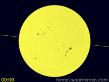 الرسوم المتحركة من عبور كوكب الزهرة من حزيران عام 2012 في الإحداثيات الاستوائية والصيف في أوروبا الوسطى.[5]