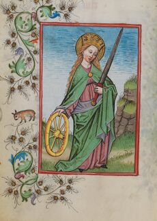 Medieval hagiographies, such as the Legenda sanctorum, record that St. Catherine of Alexandria was sentenced to be executed on one of these devices for refusing to renounce her Christian belief, which thereafter became known as the Catherine wheel, also used as her iconographic attribute. It is said the wheel miraculously broke when she touched it; she was then beheaded.[26] As an attribute, it is usually shown broken in a small version beside her, or sometimes as a miniature she holds in her hand; the sword then used is also often shown.